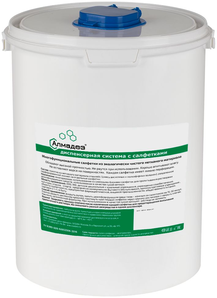 Диспенсерная система с салфетками «Алмадез» используется как в сухом виде в качестве ветоши, так и во влажном состоянии после пропитки раствором дезинфицирующего или моющего средства.