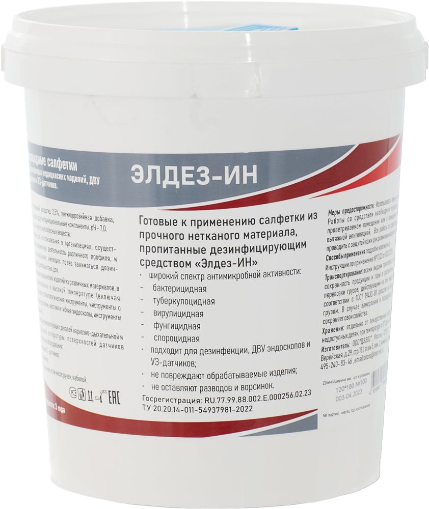 Влажные салфетки в виде перфорированной ленты (100 салфеток размером 180×140 мм) в емкости-диспенсере в виде банки из плотного полимерного материала с двойными зажимными крышками (внутренняя крышка с функциональной прорезью для извлечения одной салфетки) пропитанные дезраствором «Элдез-ИН».