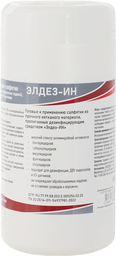 Влажные салфетки в виде перфорированной ленты (60 салфеток размером 120×180 мм) в емкости-диспенсере в виде банки из плотного полимерного материала с двойными зажимными крышками (внутренняя крышка с функциональной прорезью для извлечения одной салфетки) пропитанные дезраствором «Элдез-ИН».